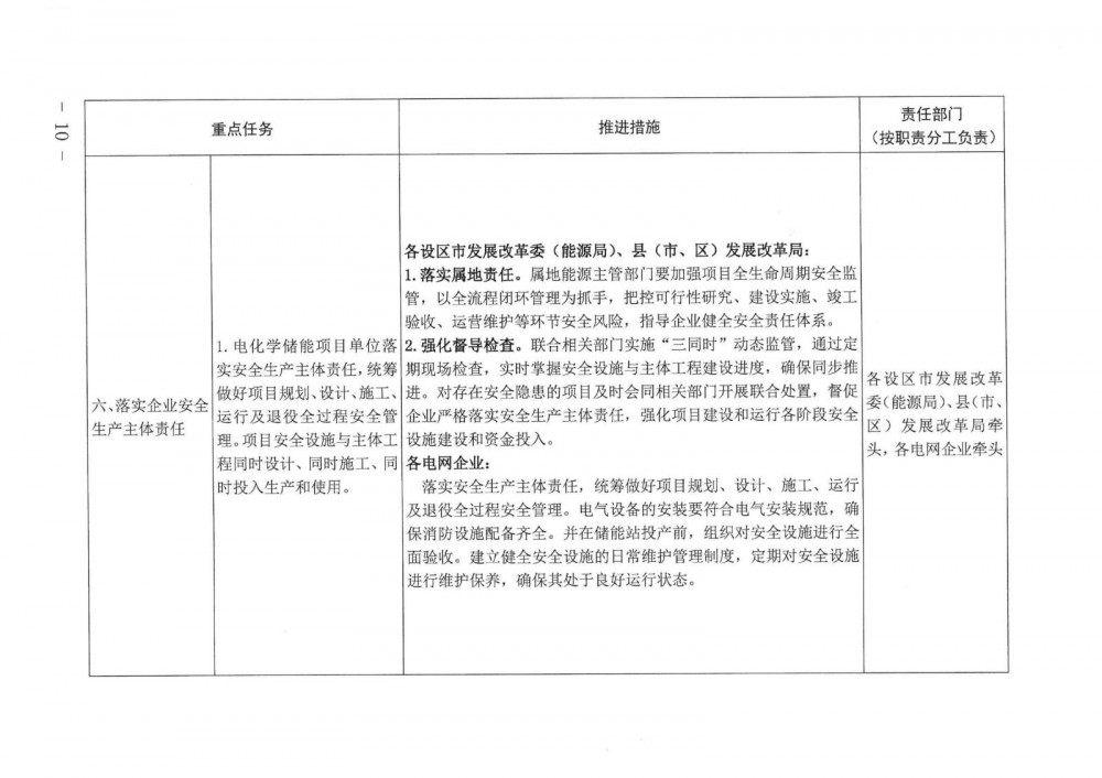 (一)明确监管职责分工。严格按照“三管三必须”和“谁主管谁牵头、谁为主谁牵头、谁靠近谁牵头”原则,进一步厘清并压实电化学储能项目安全监管责任,各县(区)、新区发展改革部门应切实履行属地监管职责,督促项目单位全面落实安全生产主体责任,明确项目法定代表人或实际控制人为安全生产第一责任人,严格执行安全设施“三同时”(安全设施与主体工程同步设计、施工、使用)管理要求。