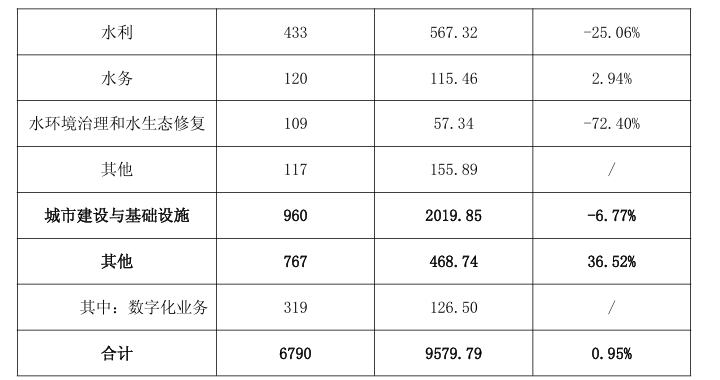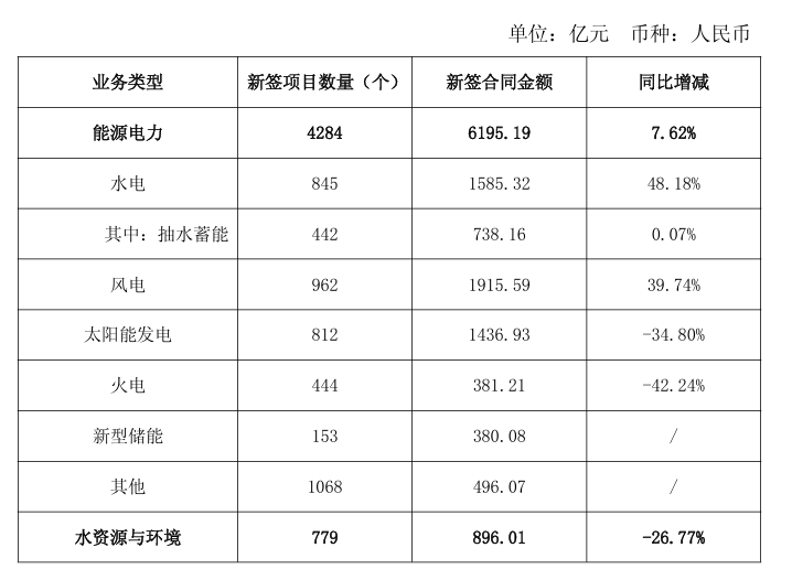 在细分业务中,能源电力业务新签项目数量4284个,新签合同金额6195.19亿元,同比增长7.62%。其中,新型储能新签项目数量153个,合同金额380.08亿元;水资源与环境业务新签项目数量779个,新签合同金额896.01亿元,同比减少26.77%;城市建设与基础设施新签项目数量960个,新签合同金额2019.85亿元,同比减少6.77%。