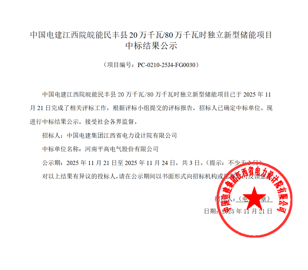 项目中标人为河南平高电气股份有限公司,中标公示期至2025年11月24日。中标原文见下: