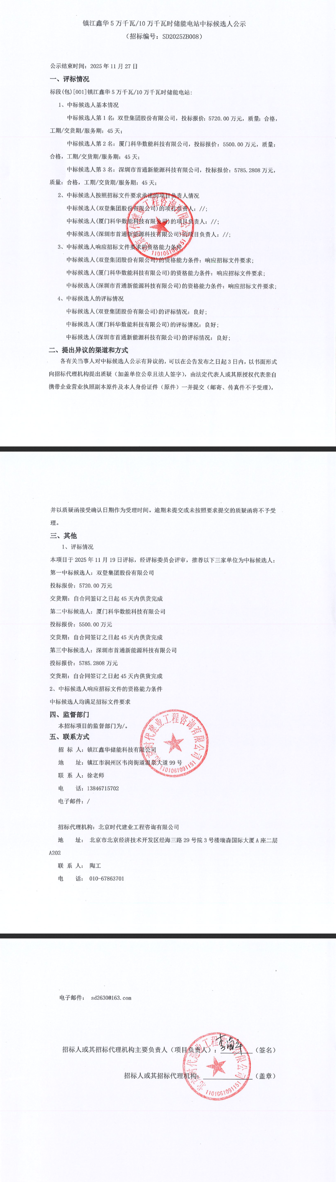 镇江鑫华5万千瓦/10万千瓦时储能电站项目中,第一中标候选人为双登集团股份有限公司,投标报价5720.00万元。第二中标候选人为厦门科华数能科技有限公司,投标报价5500.00万元。第三中标候选人为深圳市首通新能源科技有限公司,投标报价5785.2808万元。