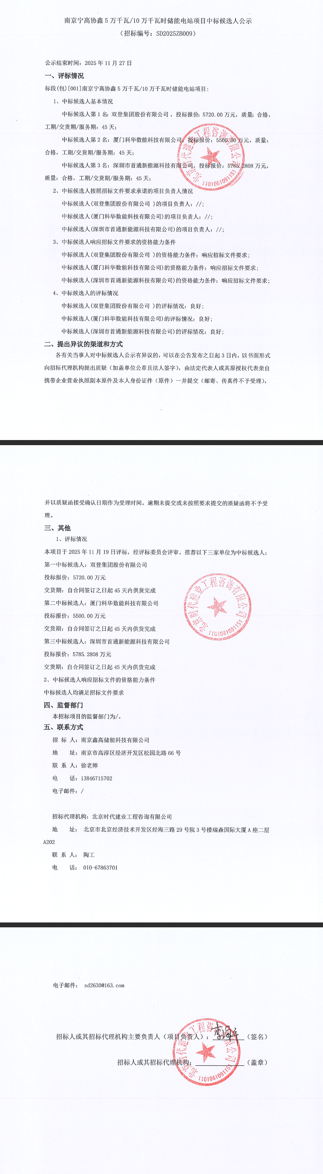 南京宁高协鑫5万千瓦/10万千瓦时储能电站项目中,第一中标候选人为双登集团股份有限公司,投标报价5720.00万元。第二中标候选人为厦门科华数能科技有限公司,投标报价5500.00万元。第三中标候选人为深圳市首通新能源科技有限公司,投标报价5785.2808万元。