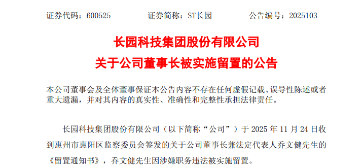 其中提及,公司于11月24日收到惠州市惠阳区监察委员会签发的关于公司董事长兼法定代表人乔文健先生的《留置通知书》,乔文健先生因涉嫌职务违法被实施留置。