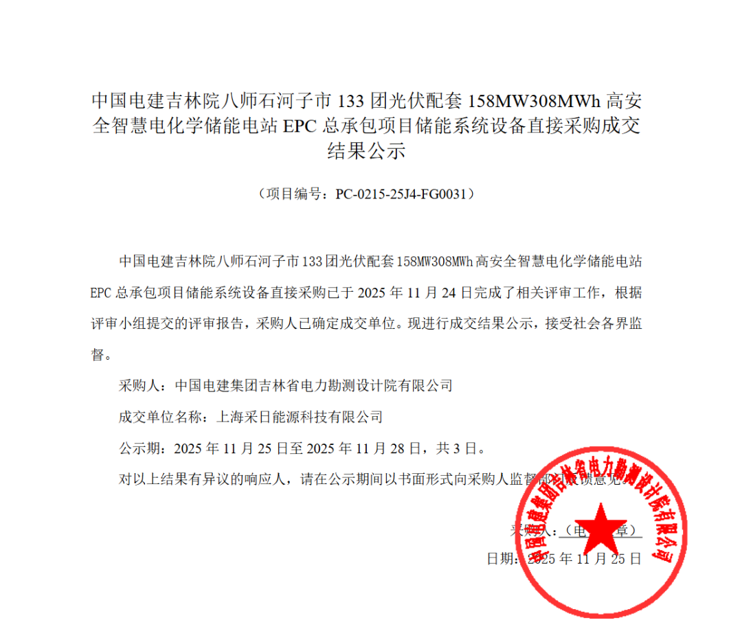 11月25日,中国电建吉林院八师石河子市133团光伏配套158MW/308MWh高安全智慧电化学储能电站EPC总承包项目储能系统设备直接采购成交结果公示。