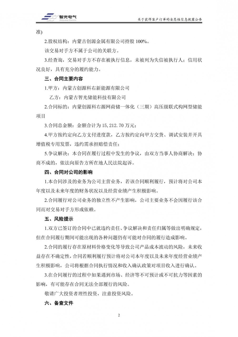 11月25日,智光电气发布公告称,公司孙公司内蒙古智光储能科技有限公司于近日与内蒙古创源科右新能源有限公司签订了金额合计为人民币 15,212.70 万元的《买卖合同》,创源科右向内蒙古智光采购高压级联构网型储能系统。