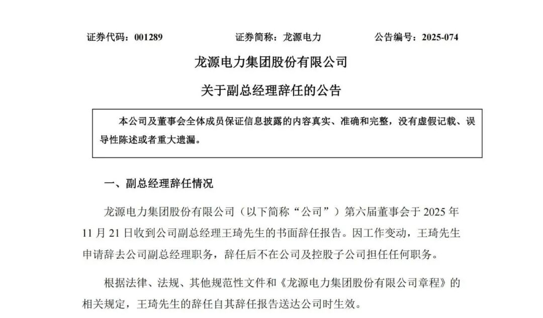 11月25日,龙源电力发布公告称,公司收到公司副总经理王琦的书面辞任报告。因工作变动,王琦申请辞去公司副总经理职务,辞任后不在公司及控股子公司担任任何职务。