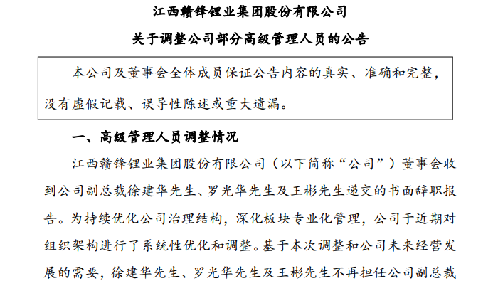 10月29日,赣锋锂业发布关于调整公司部分高级管理人员的公告,企业收到了副总裁徐建华先生、罗光华先生及王彬先生递交的书面辞职报告。