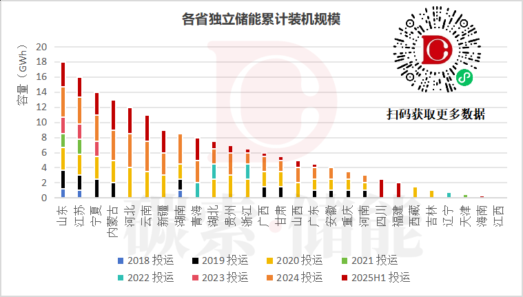 因此,在西北、华北、华东等新能源高占比或电力需求旺盛的区域,独立储能电站的建设比例更高,如甘肃、陕西、辽宁、山东、江苏等。截至2025年上半年,山东、江苏、宁夏独立储能装机规模最大,分别为15GWh、13GWh、12GWh。内蒙古更是形成集群优势,2025年已下发三批独立储能项目清单,规模超20GWh。