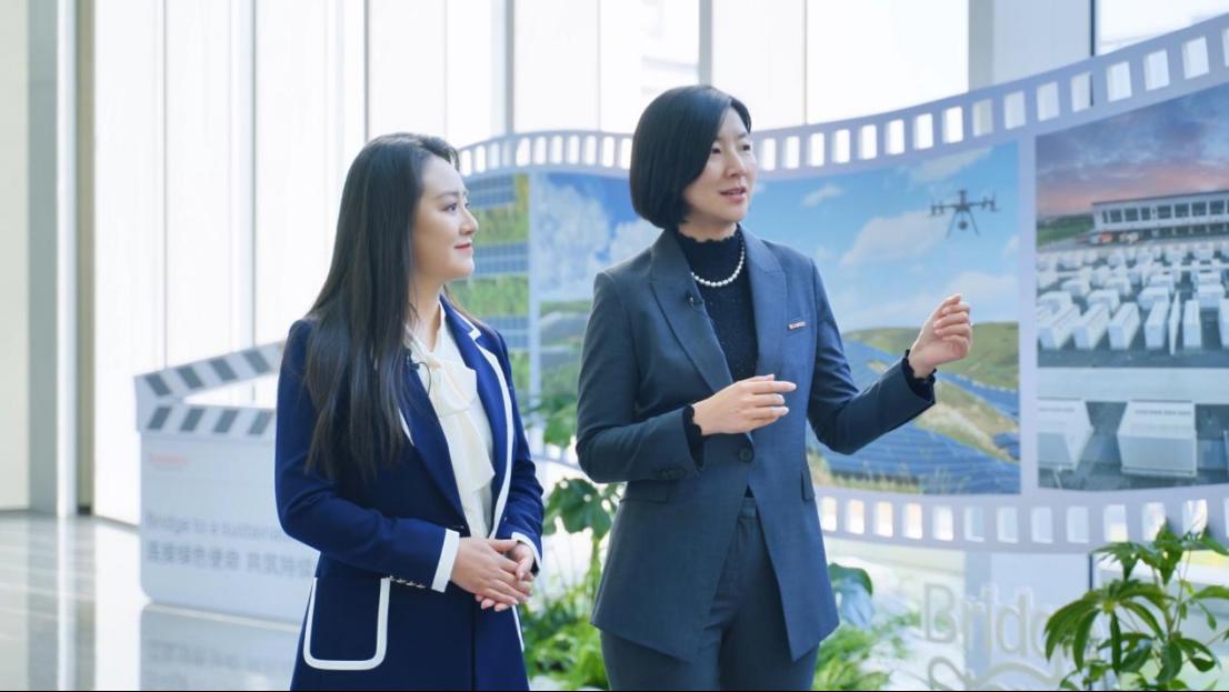 在新华社主持人的带领下,观众开启了一场沉浸式的阳光电源探厂之旅。从阳光电源总部出发,品牌中心总经理李秋宜介绍了企业在光、风、储、电、氢五大赛道的全球布局——电力电子转换设备累计装机超870GW,携手全球客户每年可避免CO₂排放约5.4亿吨。