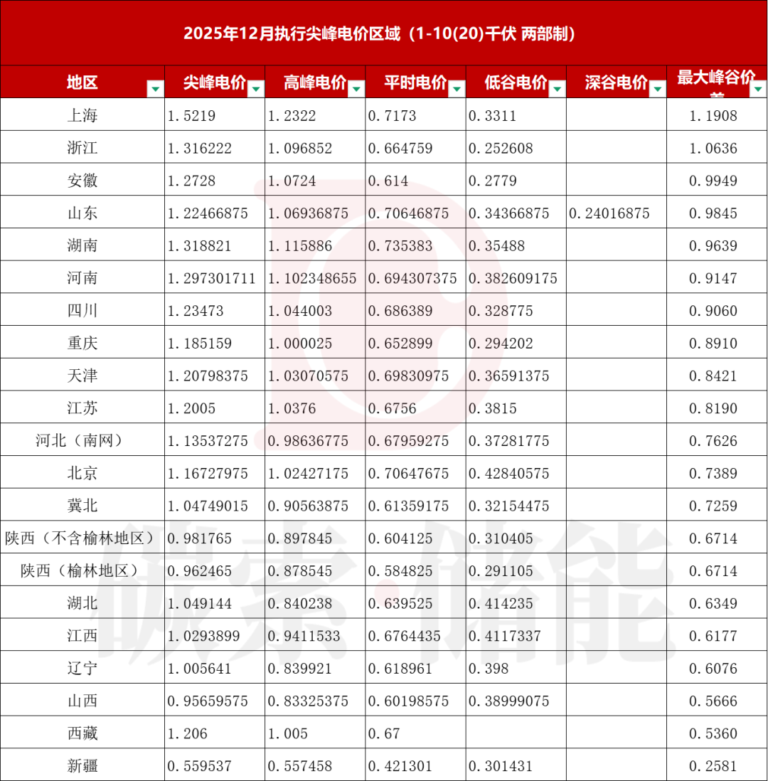 作为迎峰度冬期间保障电网稳定运行的核心调控手段,尖峰电价在本月迎来集中落地。从执行范围来看,安徽、北京、河北(南网)、河南、湖北等20余个区域已明确执行尖峰电价政策,覆盖范围基本涵盖华北、华东、华中、西南等用电负荷集中区域。这些区域既是冬季用电保障的重点区域,也是储能项目落地的核心潜力市场。