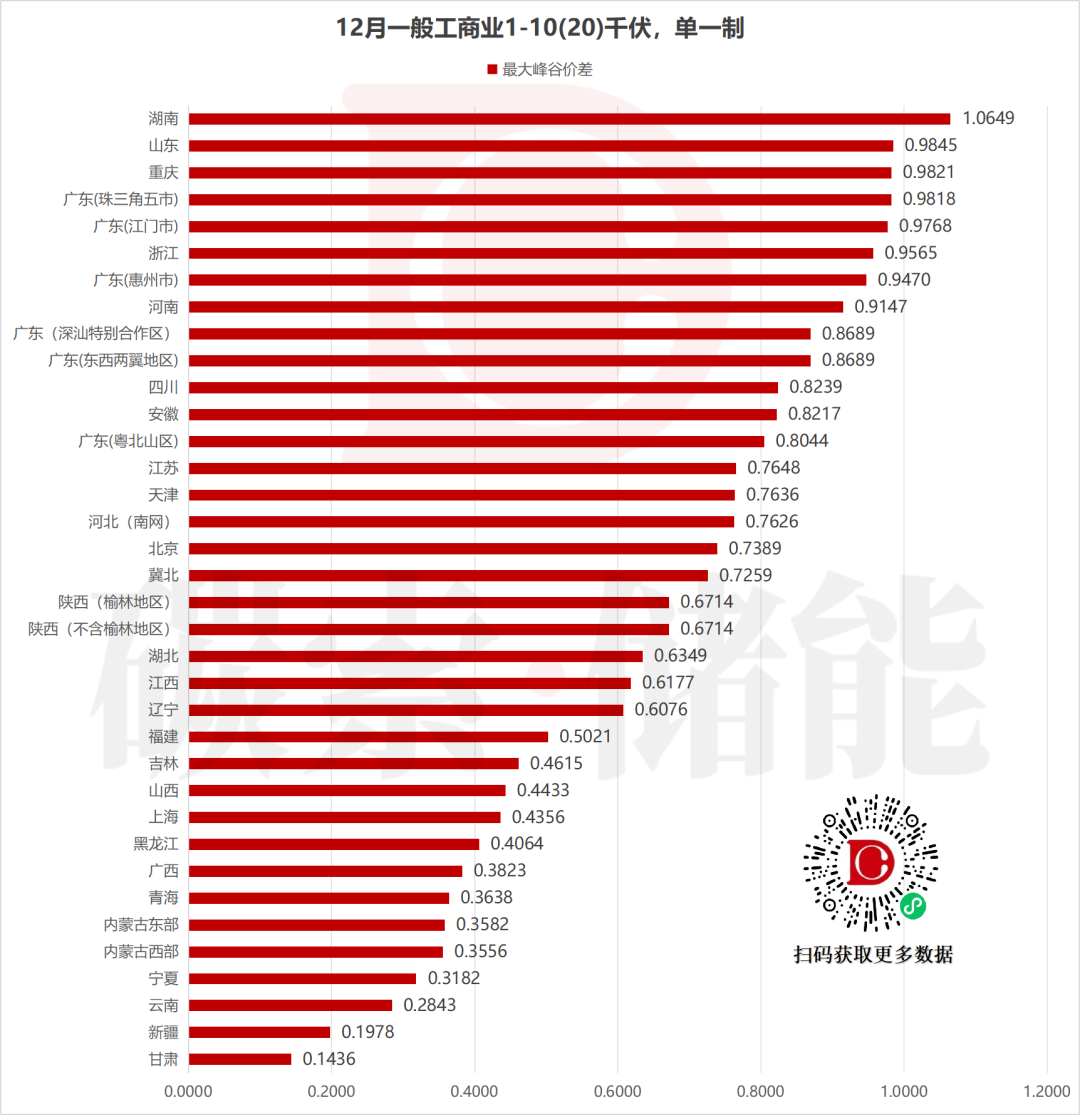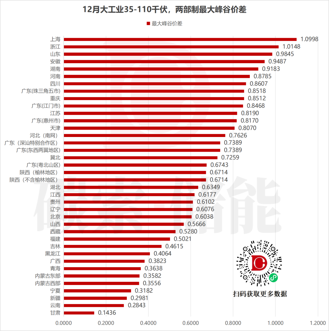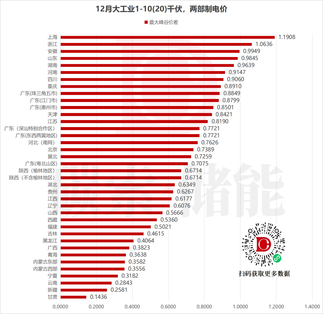 具体来看,1-10/20千伏等级中,上海以1.1908元的最大峰谷价差领跑全国,环比涨幅达30.09%;浙江1.0636元、安徽0.9949元紧随其后,位列全国前三。