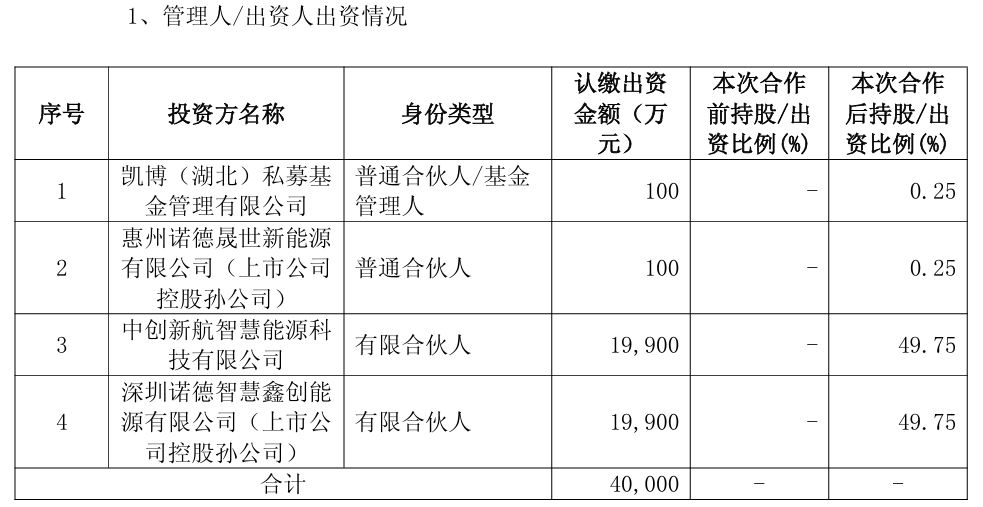 具体来看,该基金规模4亿元。其中,中创新航智慧能源科技有限公司作为LP认缴出资1.99亿元,占比49.75%,该公司为中创新航全资子公司;深圳诺德智慧鑫创能源有限公司作为LP认缴出资1.99亿元,占比49.75%;凯博(湖北)私募基金管理有限公司作为管理人/GP1认缴出资100万元;惠州诺德晟世新能源有限公司作为GP2认缴出资100万元。