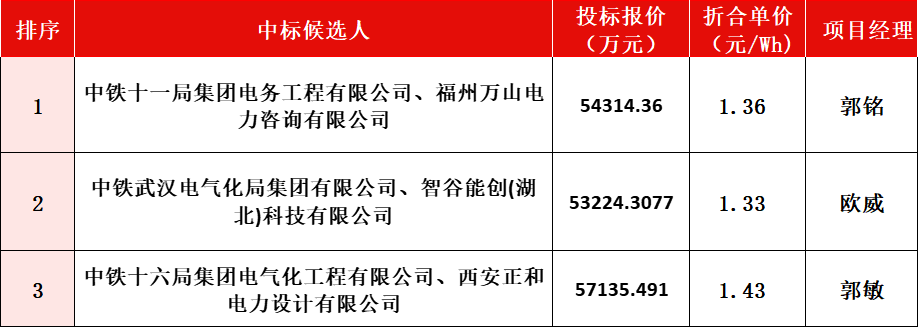 项目第一中标候选人为中铁十一局集团电务工程有限公司、福州万山电力咨询有限公司,投标报价:54314.36万元,折合单价1.3576元/Wh;第二中标候选人中铁武汉电气化局集团有限公司、智谷能创(湖北)科技有限公司,投标报价:53224.3077万元,折合单价1.3306元/Wh;第三中标候选人中铁十六局集团电气化工程有限公司、西安正和电力设计有限公司,投标报价:57135.491万元,折合单价1.4284元/Wh。