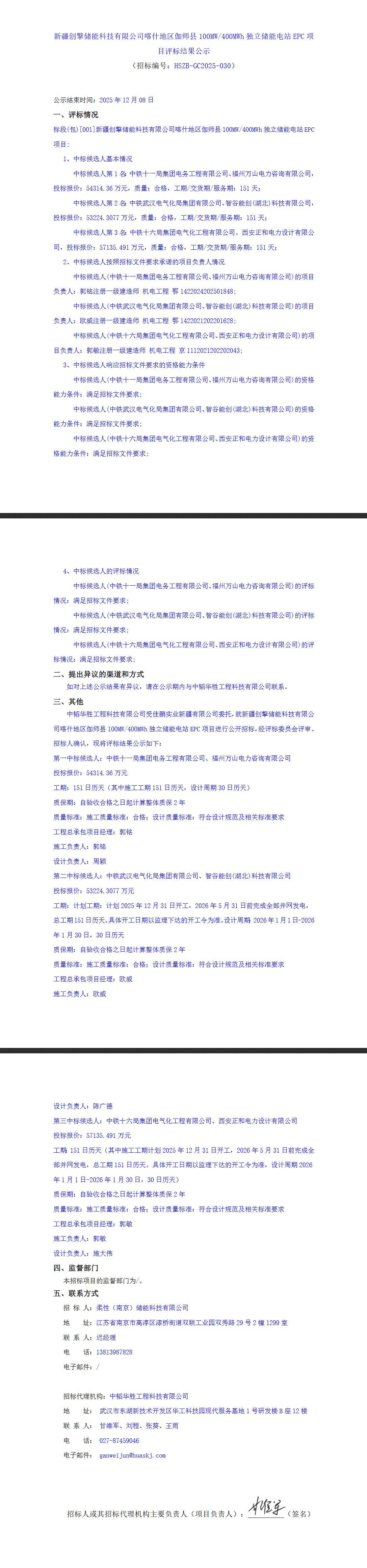 碳索储能网获悉,近日,新疆创擎储能科技有限公司喀什地区伽师县100MW/400MWh独立储能电站EPC项目发布评标结果公示。