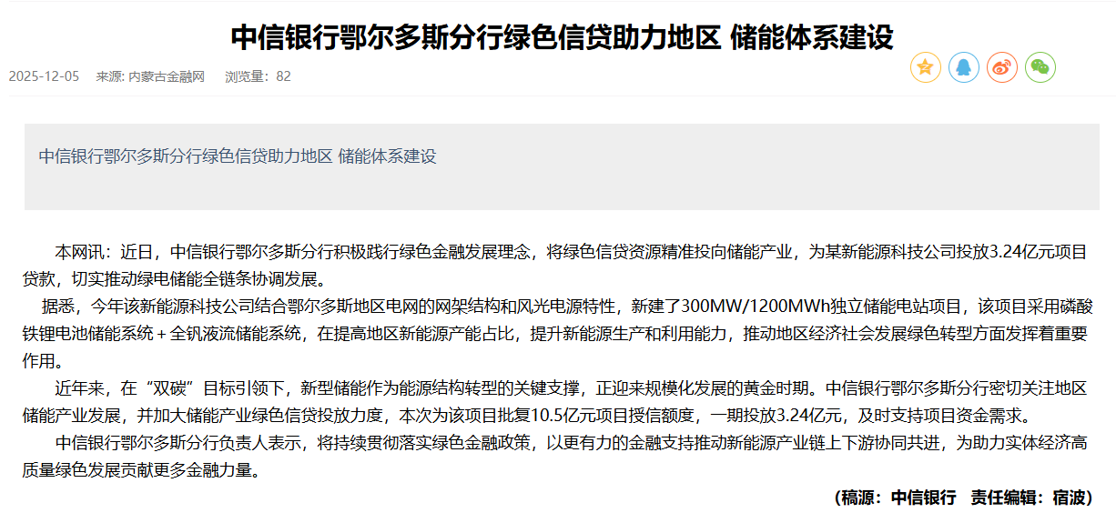内蒙古金融网12月5日消息,近日,中信银行鄂尔多斯分行积极践行绿色金融发展理念,将绿色信贷资源精准投向储能产业,为某新能源科技公司投放3.24亿元项目贷款,切实推动绿电储能全链条协调发展。