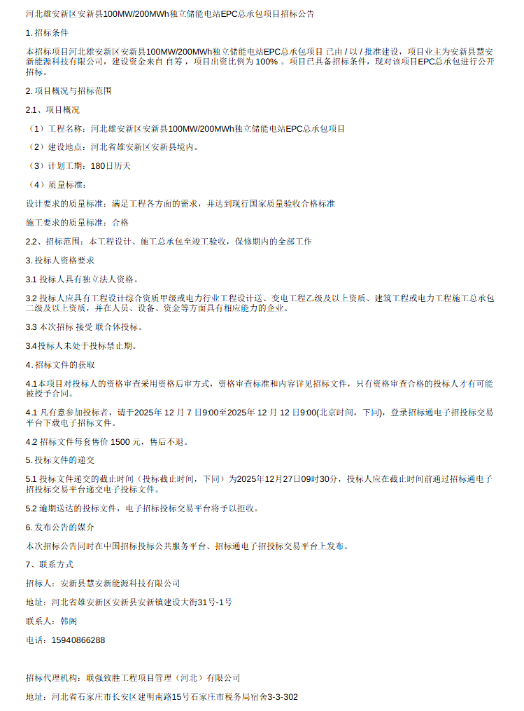 12月7日,河北雄安新区安新县100MW/200MWh独立储能电站EPC总承包项目招标公告发布。项目业主为安新县慧安新能源科技有限公司,建设资金来自 自筹 ,项目出资比例为 100% 。项目已具备招标条件,现对该项目EPC总承包进行公开招标。河北雄安新区安新县100MW/200MWh独立储能电站EPC总承包项目,建设地点在河北省雄安新区安新县境内,项目计划工期180日历天。招标范围包括本工程设计、施工总承包至竣工验收,保修期内的全部工作。投标人应具有工程设计综合资质甲级或电力行业工程设计送、变电工程乙级及以上资质、建筑工程或电力工程施工总承包二级及以上资质,并在人员、设备、资金等方面具有相应能力的企业。本次招标接受联合体投标。