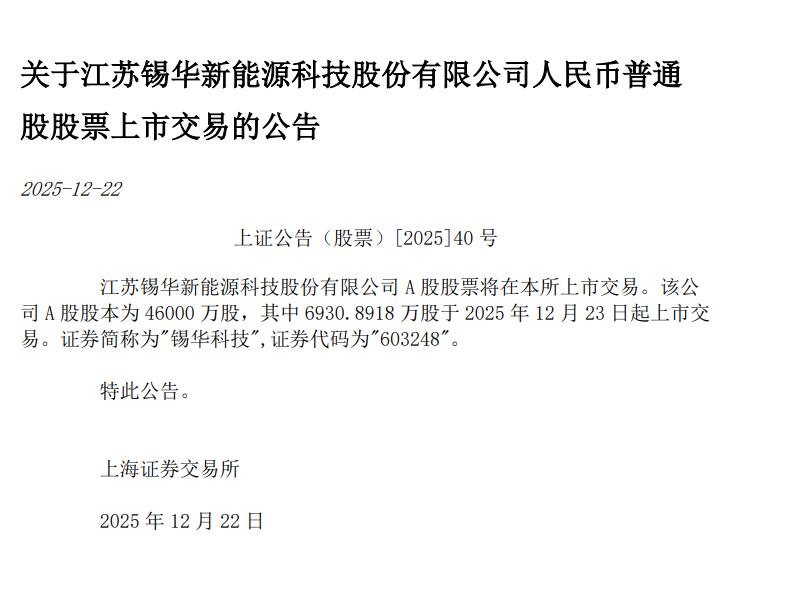 公告显示,江苏锡华新能源科技股份有限公司 A 股股票将在上交所上市交易。该公司 A 股股本为 46000 万股,其中 6930.8918 万股于 2025 年 12 月 23 日起上市交易。证券简称为"锡华科技"。