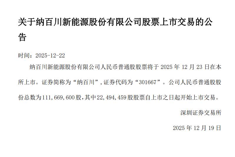公告显示,纳百川新能源股份有限公司人民币普通股股票将于 2025 年 12 月 23 日在本所上市。证券简称为“纳百川”。公司人民币普通股股份总数为111,669,600股,其中22,494,459股股票自上市之日起开始上市交易。